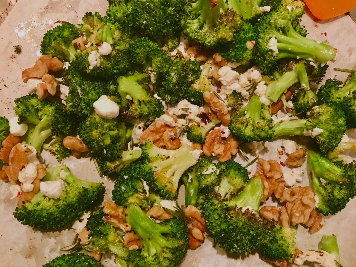 Quick post that I wanted to share (if you were looking for a tasty side dish for your delicious homemade Valentine’s dinner… quick-roasted broccoli with goat cheese and walnuts! The kicker that makes this more exciting is how you season the broccoli… which is generously. Enjoy!