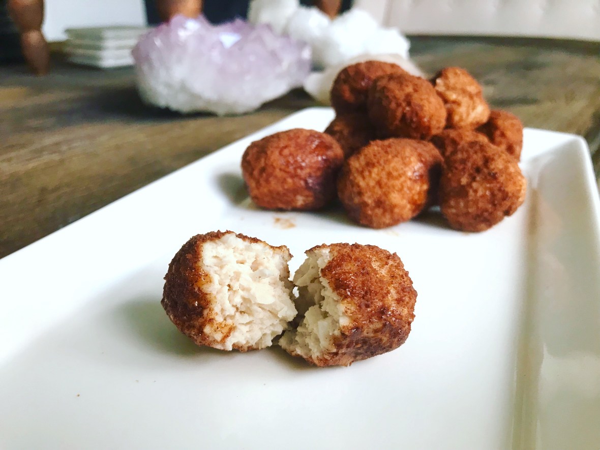 - Add your shredded coconut, cream cheese, vanilla, 1 tsp cinnamon, coconut oil and agave to a large mixing bowl and blend with a mixer. If the mixture appears runny, add ¼ cup of shredded coconut and continue to mix until you have a pasty mixture that you can shape.