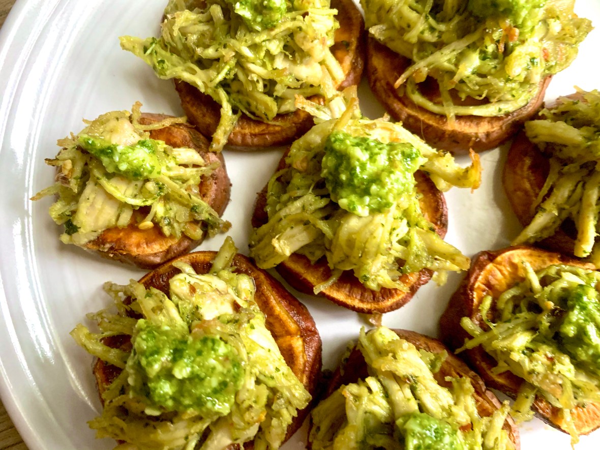 - Once the pesto is finished, mix 1/3 to 1/2 cup of pesto into your cooked/shredded chicken and mix thoroughly. Chicken should be thoroughly coated – add a teaspoon at a time if it appears dry. Spoon the chicken mixture neatly onto your sweet potato medallions, and place back into the oven for another 5-7 minutes, reheating thoroughly.