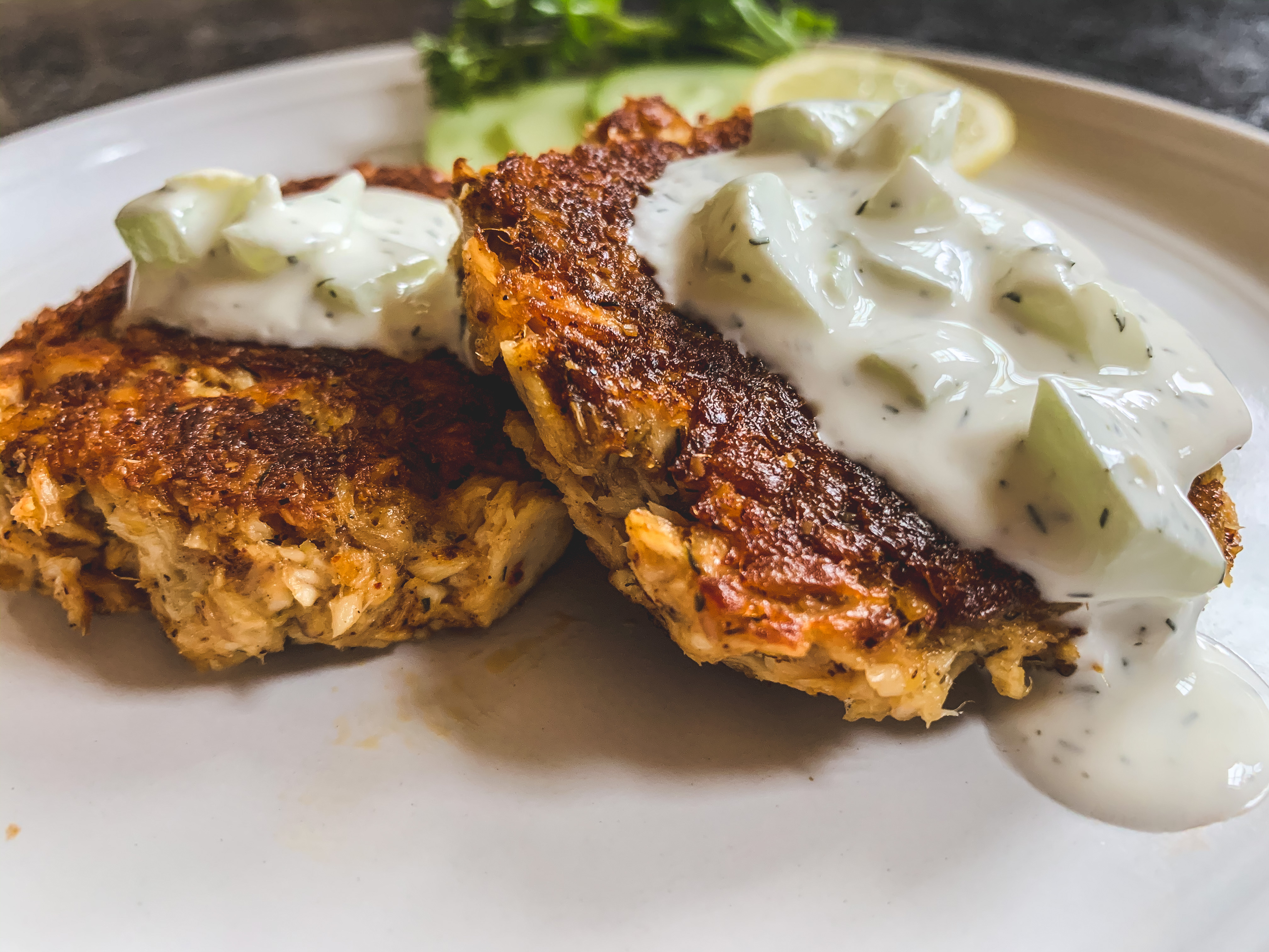 - Once the salmon patties are done, serve with a dollop of your tzatziki sauce. If you’re a sauce-heathen like me, just straight up drench them. Please know that I smothered mine, these photos don’t capture the accurate sauce to patty ratio. You can always pair them with a few nice salads, too…